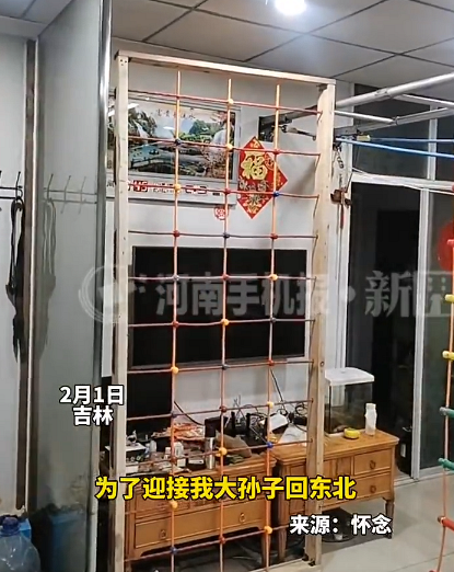 近日,吉林。一位爷爷为了迎接过年回家的大孙子,在家里做了网绳架、绳梯、平衡木等,使出浑身解数将家做成游乐场。网友纷纷点赞:“好停车吗,周末带孩子去玩~” 来源河南手机报