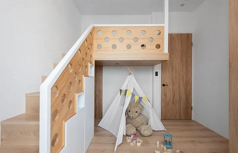 喜爱沉稳色调,但又顾虑小孩成长期需要明亮的环境。因此设计师以归朴的设计思路,采用原色调作为整体色彩主轴,借由白漆面、大理石纹及原木色的映衬,相互勾勒出空间线条;同时搭配充足采光与开放的格局优势,让家呈现明快但又不失沉稳的生活氛围。 平面布局图 客厅 玄关转进客厅的水泥墙以圆弧造型作引导动线,除可减少因场域转换产生的截断感,原木门和圆弧倒角的置入也缓减色调不一致的突兀感,使不同材质透过弧线、得以整