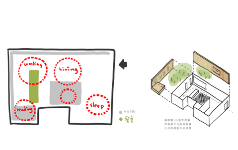 这是套66平米左右的小宅,因为屋主本身是医生,平时工作压力很大,所以她希望家能够让人感觉到放松。 ▲概念图 从概念图上很清楚,设计师将空间分成几个生活区域,灰色是收纳空间,外面则是以中岛餐桌为中心,让生活场域围绕着他,客厅也不再是这个空间的重心了。 ▲原始户型图 原始客厅其实不大,但窗户看出去有一些绿树还不错,而本来格局为三个小房间,因为屋主只需要一个房间,他希望尽量让公共空间大一些,毕竟房间只