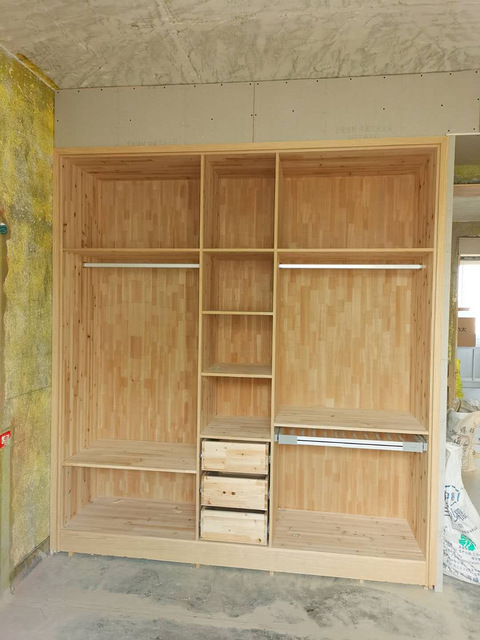 临江小区顶+阁复式楼装修,木工完工照片,阁楼的柜子不规则,会增加师傅的施工难度,比较费工夫还干不出活,柜子内部格局随业主喜好修改了很多,这就是现场打制家具的优势,业主可以看现场发挥,任意增加或者修改柜子格局;只是这家的木工活,我们会亏损,我们按照投影面积计算价格,柜子越小,越不规则,对我们而言,就越吃亏。