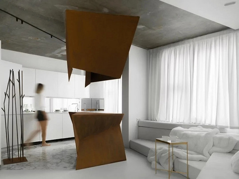 这个公寓面积为 70㎡,设计初衷是为了实用,采用非对称结构,简约风格。 白色调的空间,纯净极简的家具风格,简约而不简单 是不是觉得太白了,哈哈O(∩_∩)O 厨房与餐厅区域做了一个几何造型的金属中岛。 开放式的,空间看起来也更宽敞。卧室空间没有多余的装饰,以大量留白为主。 唯一关于色彩要讲的,是卫生间,卫生间采用了紫色和红色的拼接,再辅以大理石效果。 不知道会不会有人觉得太夸张,哈哈O(∩_∩)O