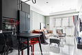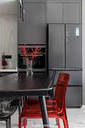 深色大理石纹餐桌+餐边柜设计,给人一种高级、高贵不可侵犯的神秘感。半透明撞色的餐椅,质感更佳。