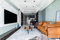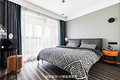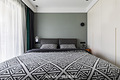 浅灰绿色主背景墙营造朦胧的美感,墨绿+高级灰配色简约又高级。亮橙色小家具局部点缀,提亮空间。