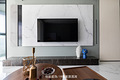 大理石电视机背景墙,在一袭灰蓝色背景衬托下,尤为突出。底下深灰色大理石砌的地台代替电视机柜简单置物,打扫方便,又美观。