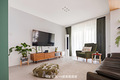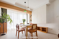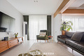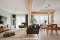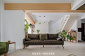 客餐厅一体,功能区保持互通、互动,顶面用木纹横梁为视觉隔断,以大自然的力量打造舒缓调性的中古风,再搭配大量原木家具、墨绿色软装配饰、热带阔叶绿植塑造南洋风的热情个性。