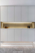 玄关本就较为方正,但正对墙面,视觉美感不够,实用性不高。 做整面式的柜体,中部镂空,底部20公分抬高,方便物品的收纳与放置。