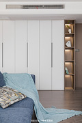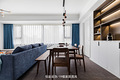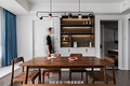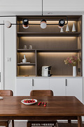 将北面书房墙体挖空,做嵌入式餐边柜。白色+木色柜体分段设计,开放式与柜门式的组合搭配,开放式柜体辅以灯带设计,素雅之余又多了几分隆重的仪式感,是对高品质人类生活的基本尊重。
