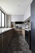 长U型厨房拥有狭长的空间,左右两边对功能进行合理区分,可以更好地规划空间动线。 上白下木双色橱柜,搭配仿古砖,更加突出空间的层次感。