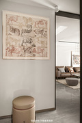 客厅主沙发选择棕色真皮沙发,装饰画选择爱马仕的丝巾靠画,画中的一抹橙色和局部的深棕色与主沙发的颜色相融合。沙发边上的网红氛围落地灯,光晕打在艺术涂料的墙面上显得非常柔和自然。