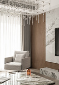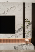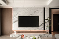 电视背景墙的处理,把原先精装修交付的房门拆除,换成了木格栅隐形门,与大理石电视背景作为一个融合的整体。